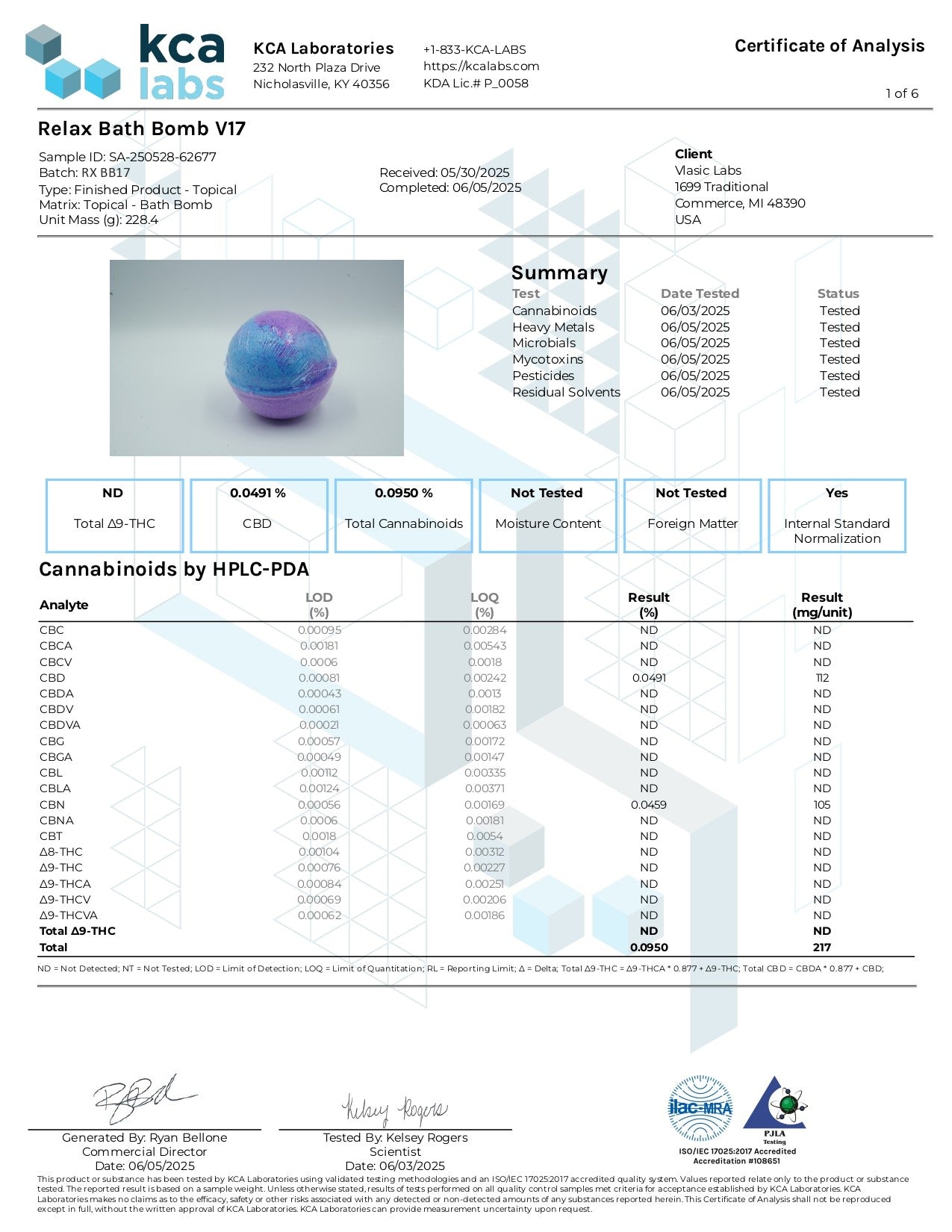 At 7 ounces and containing 100mg of CBD and 100mg of CBN, the Vlasic Labs Relax Bath Bomb offers a luxurious and aromatic bath experience. The lavender and chamomile scent fills the air with a soft, soothing fragrance—perfect for unwinding at the end of the day. As it dissolves, it creates a calming atmosphere and leaves your skin feeling refreshed and smooth.
