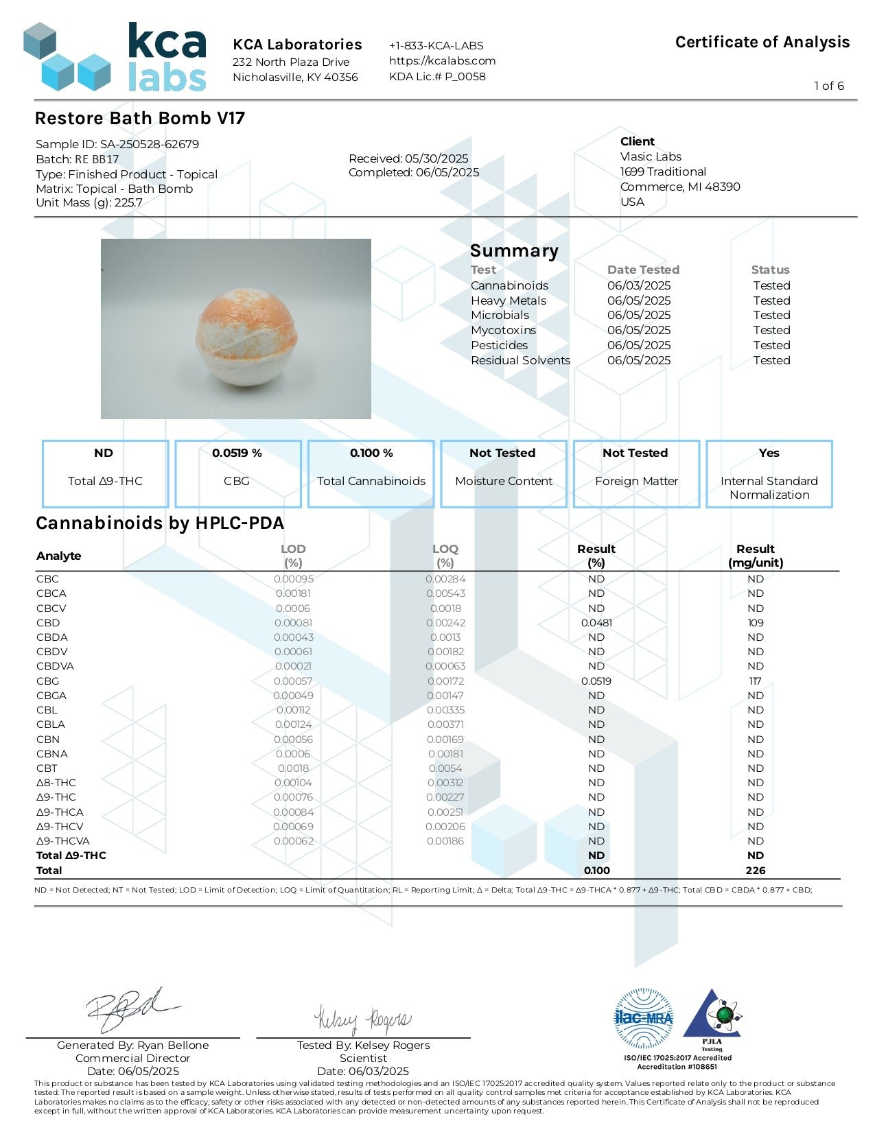 At 7 ounces and containing 100mg of CBD and 100mg of CBG, the Vlasic Labs Restore Bath Bomb offers a refreshing and aromatic bath experience. The Bergamot and Citrus fragrance fills your space with bright, uplifting notes, creating an energizing atmosphere that enhances your self-care routine. As it dissolves, it leaves your skin feeling soft and nourished.