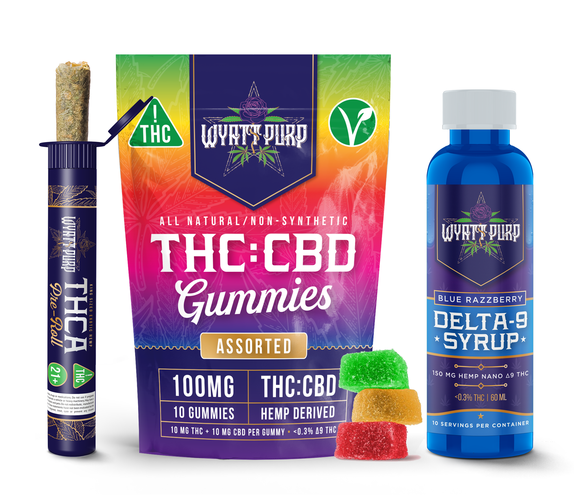 Get ready to experience the best of Wyatt Purp with our THC and THCA sampler pack. This pack includes a Platinum Pre-Roll, Assorted Gummies, and a Delta 9 syrup, giving you the perfect introduction to our top-tier products. Whether you prefer smoking, snacking, or sipping, this sampler pack has got you covered. Each product is carefully crafted to deliver a potent and enjoyable experience, so you can sit back, relax, and indulge in the goodness of Wyatt Purp!